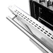 Below, the 5.36 cu. ft. true convection oven uses a fan-assisted circulation system to ensure even baking and roasting across all racks. The oven features a triple-layer insulated glass door and bright interior lighting for excellent visibility. Included accessories such as two telescopic stainless steel oven racks, an air fryer basket and drip pan, wok support, reversible griddle, and an LP conversion kit add everyday versatility.