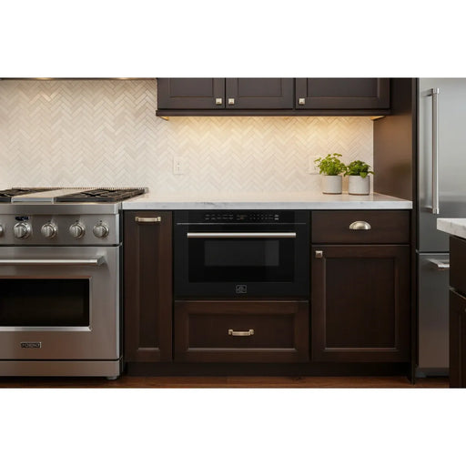 Upgrade your kitchen with the Forno Capoliveri FMWDR3000‑24BLK Black Built-In Microwave Drawer, finished in black stainless steel with your choice ...