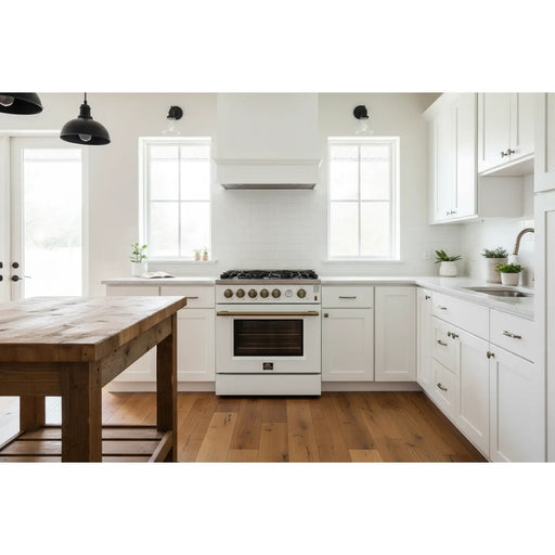 Forno Massimo FFSGS6125-36WHT 36" White Dual Fuel Range, Antique Brass, 6 Burners, 5.36 cu. ft. True Convection Oven