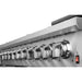 The cooktop features eight sealed gas burners with a combined output of 107,000 BTU, including a 20,000 BTU dual‑ring burner for high‑heat searing and precise low‑temperature simmering. Continuous heavy‑duty cast iron grates provide stable cookware support and easy movement, while the recessed black enamel cooktop cavity helps contain spills for simpler cleanup.
